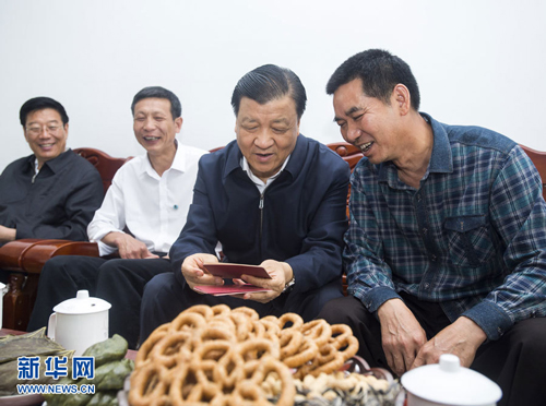 5月8日至11日,中共中央政治局常委、中央书记处书记刘云山在湖南调研。这是5月9日,刘云山在郴州望仙镇和平村村民吴西林家中了解政府相关补助的落实情况。 新华社记者 王晔 摄